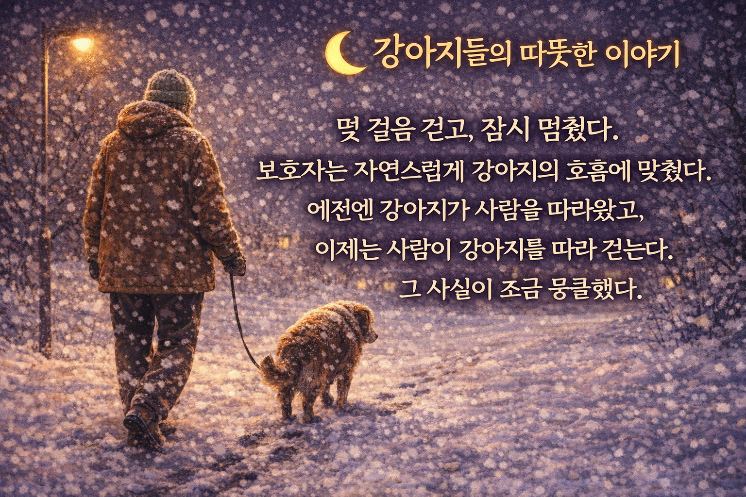 | 강아지들의 따뜻한 이야기 1편 - 겨울을 함께 보내는 반려견 이야기 🌙 (1) | 2026.01.11 |