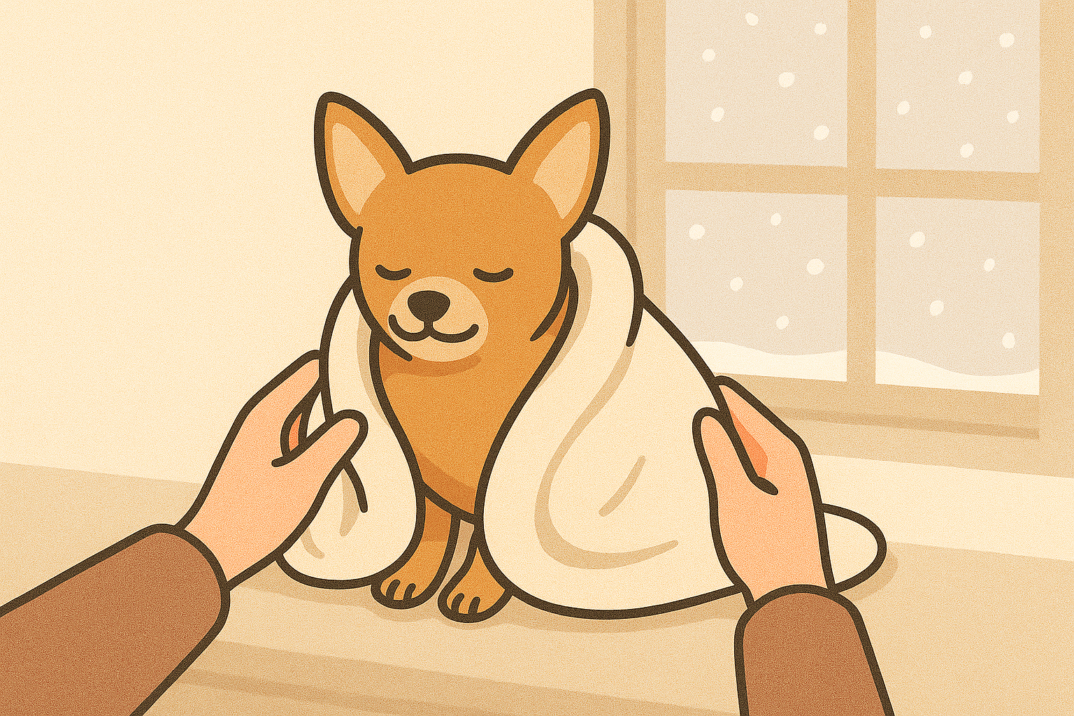 외출 전에는 패딩, 발 보호용 부츠, 귀·목을 덮는 머플러형 스카프를 착용시키고, 귀가 후에는 수건이나 드라이기로 완전히 건조시켜야 합니다. 젖은 발바닥은 체온을 급격히 빼앗습니다.